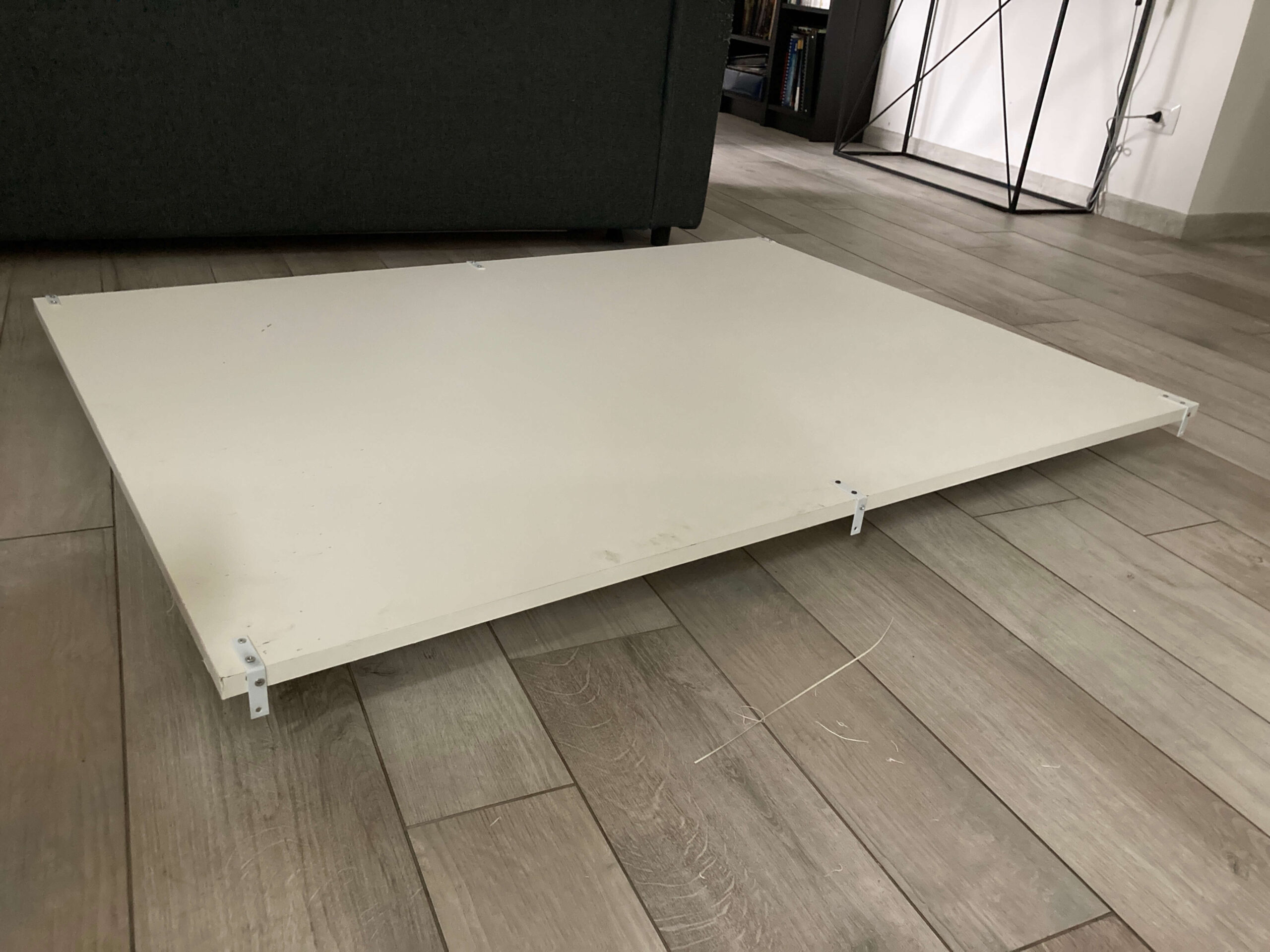 along the edges and center. Before flipping the panel to rest on the wheels, I also attached the white L-brackets, 3 per side, to the panel edges. These will be used later to secure the KALLAX units.
