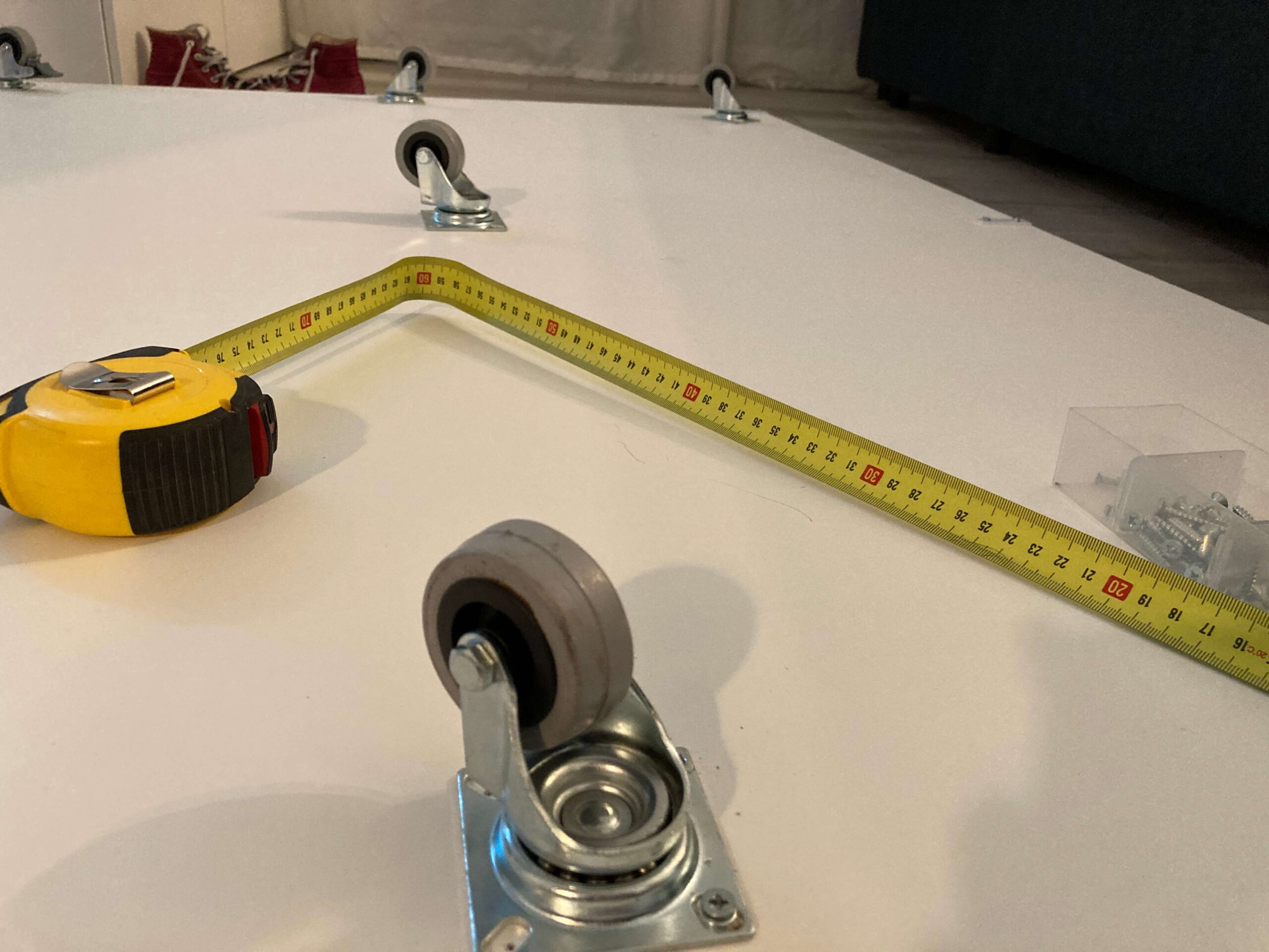 I installed 11 wheels on my base, but you can adjust the number based on the table’s weight and the material stored inside. In this case, more is better! It will make moving the table much easier.