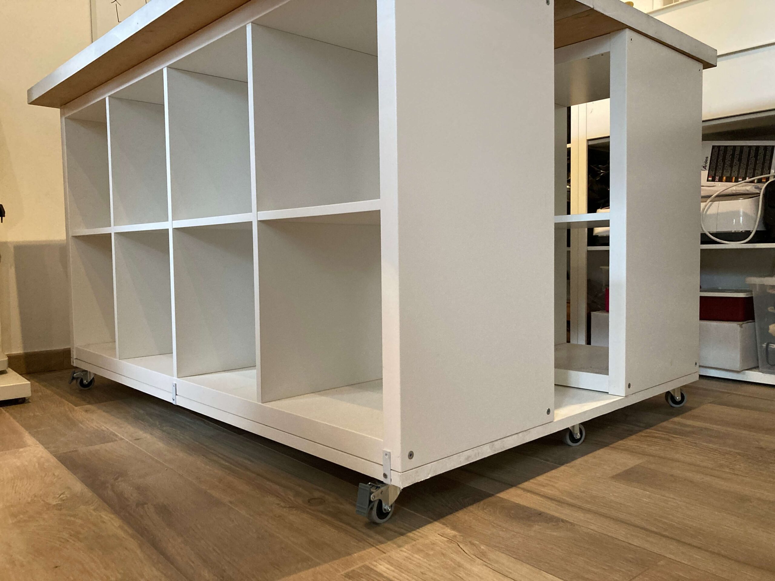 Now it’s time to assemble the two KALLAX units following the instructions. Once built, I placed them on the base (you’ll need two people for this) at both sides, aligned with the panel edges, leaving an empty space in the middle to store large-format paper or fabric rolls.