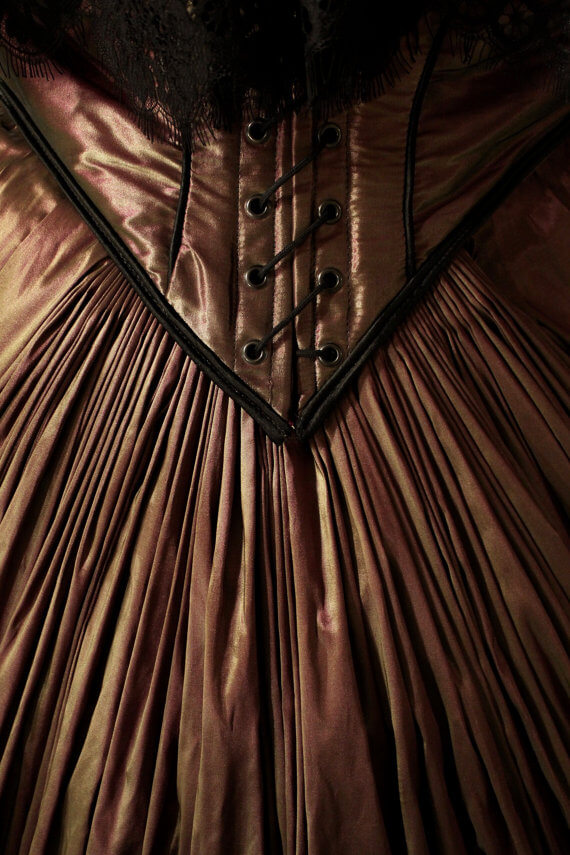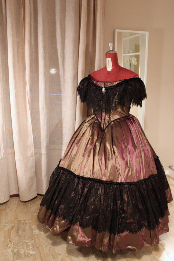 Abito vittoriano da Ballo con silhouette del 1860 Modello “Rosangela”. L’abito è realizzato SU MISURA in Taffetà color malva cangiante verde , decorato con pizzo nero e rifinito con passamaneria in nastro nero.