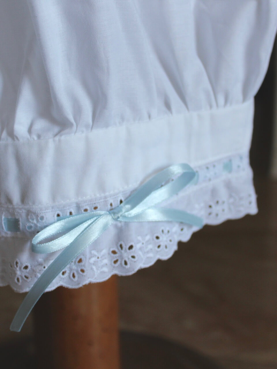 Sono realizzati in batista di cotone bianca e impreziositi con ย pizzo di sangallo con passanastro e nastrino azzurro.